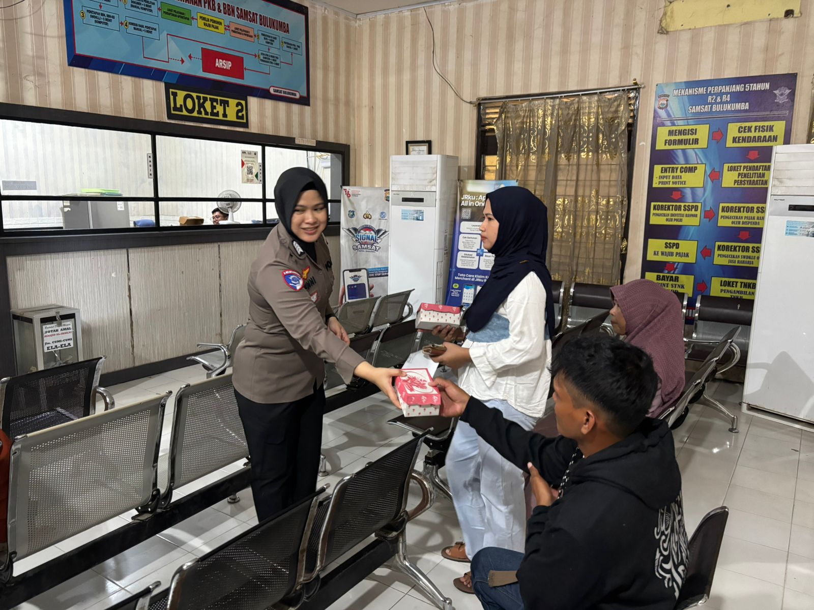 Dalam aksi tersebut, Bripka Arwini terlihat menyambangi satu per satu warga yang sedang mengantre di ruang tunggu. Dengan senyum ramah, ia membagikan paket kotak makanan Kue dan Air Minum kepada warga sebagai wujud kepedulian dan rasa syukur Polri di hari Jumat.